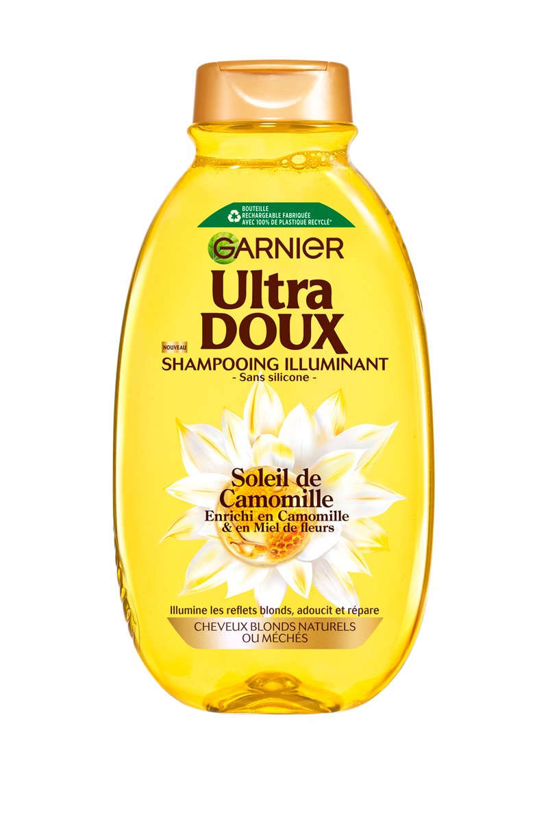 Receta original iluminadora para el cabello rubio, Ultra Doux Soleil de Camomille combina en su gama dos ingredientes con propiedades destacables: la camomila, conocida por su poder iluminador, y la miel de flores, conocida por sus virtudes reparadoras.