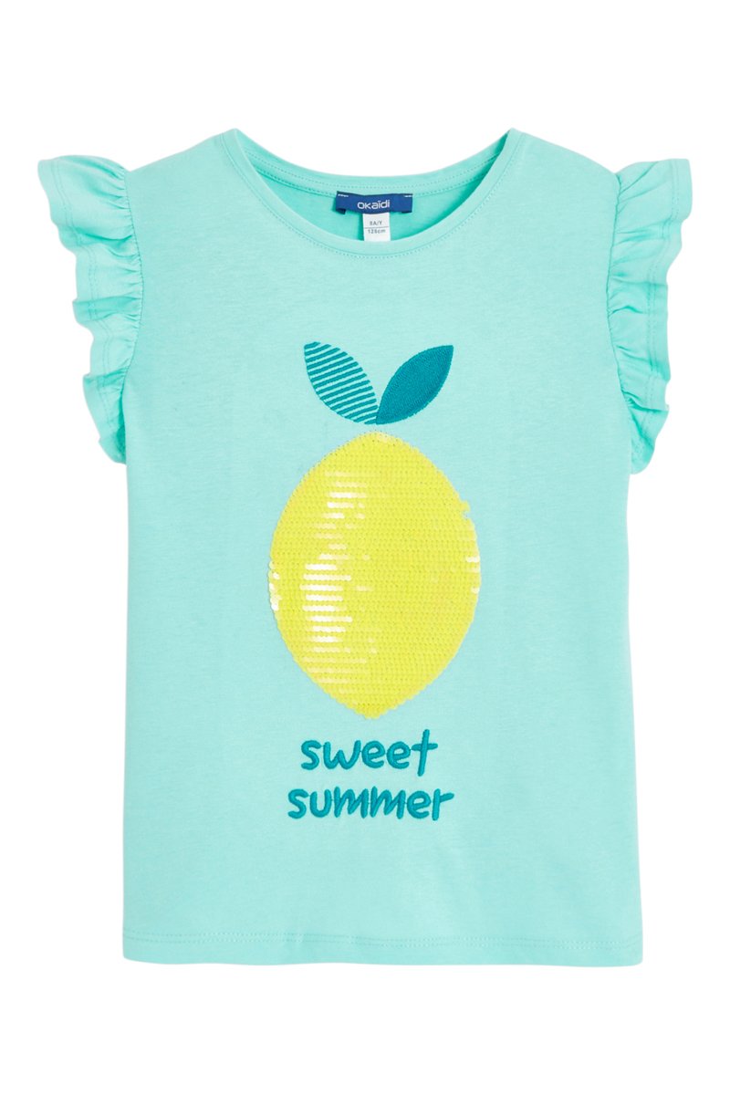 Texto bordado, estampado de limón y lentejuelas delante.