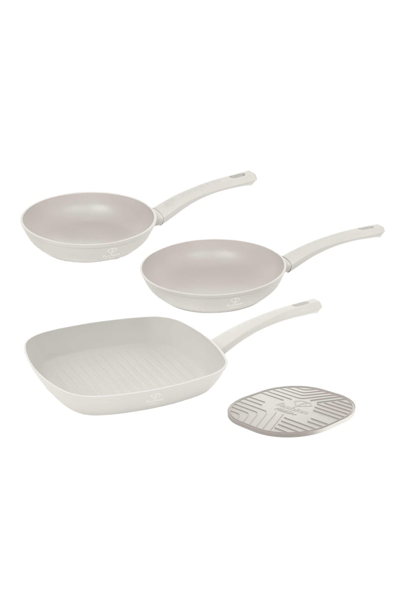 2 sartenes, 1 grill y 1 salvamanteles Matte Cream - 20 cm, 24 cm y 28 cm
