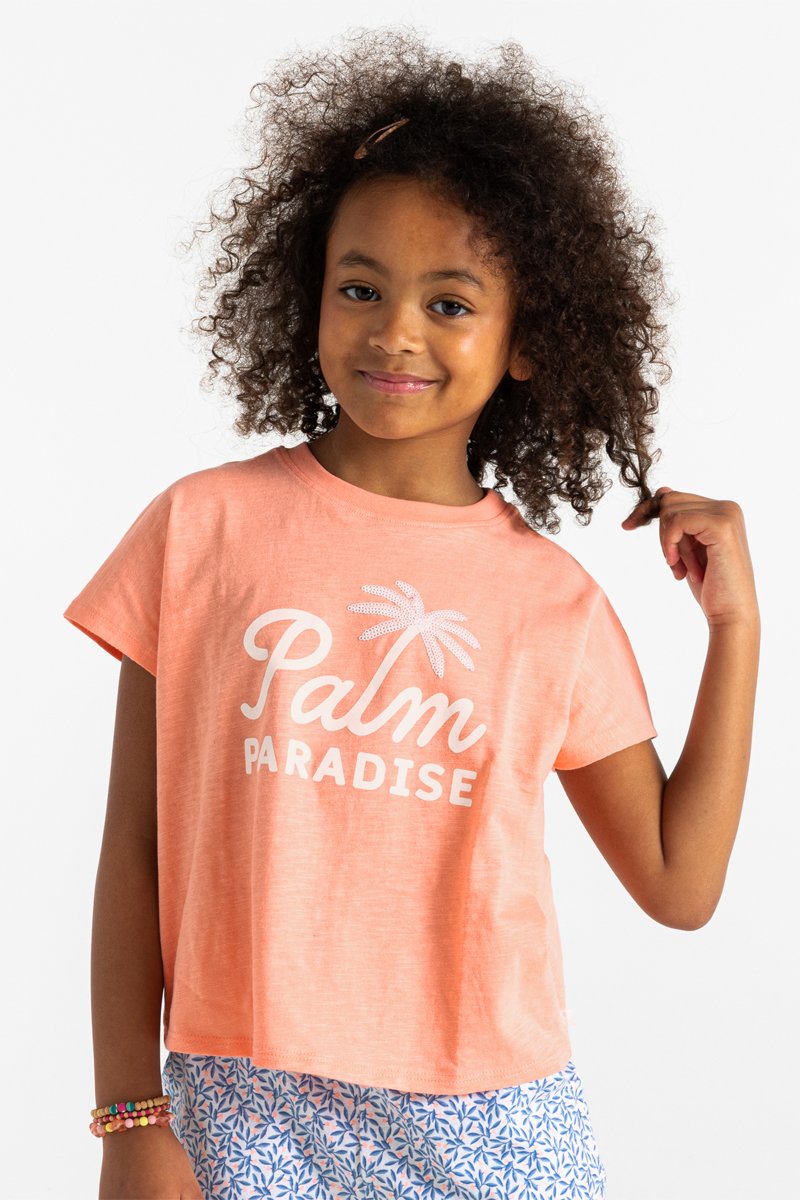 Texto, estampado de palmera y lentejuelas delante.