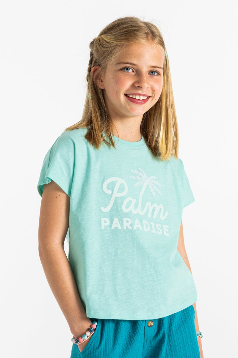 Texto, estampado de palmera y lentejuelas delante.