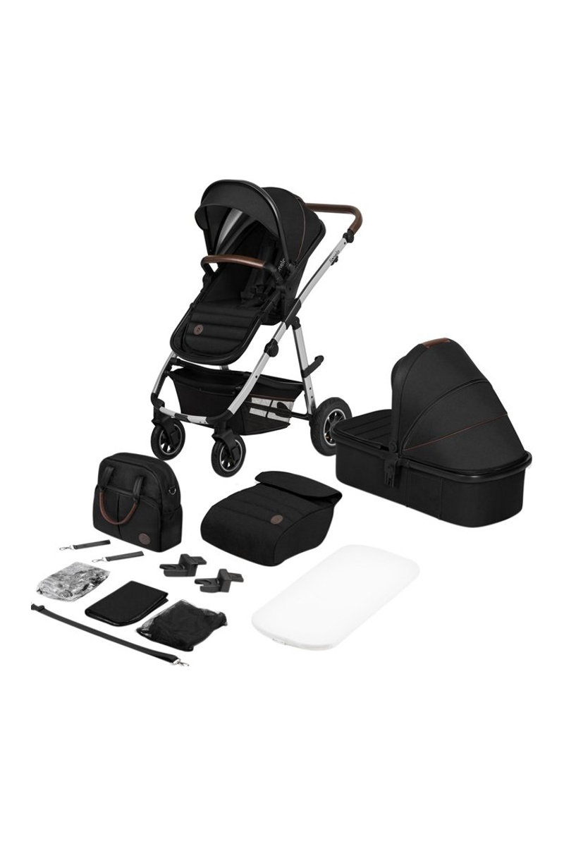 Chasis de la silla de paseo, ruedas hinchables, capazo, base del capazo, colchón, funda para silla de paseo, asiento de la silla de paseo, funda de reposapiernas, funda de lluvia (universal para el capazo y la silla de paseo), mosquitera (universal para el capazo y la silla de paseo), adaptadores de portabebés, bolsa de transporte y cambiador incluidos.