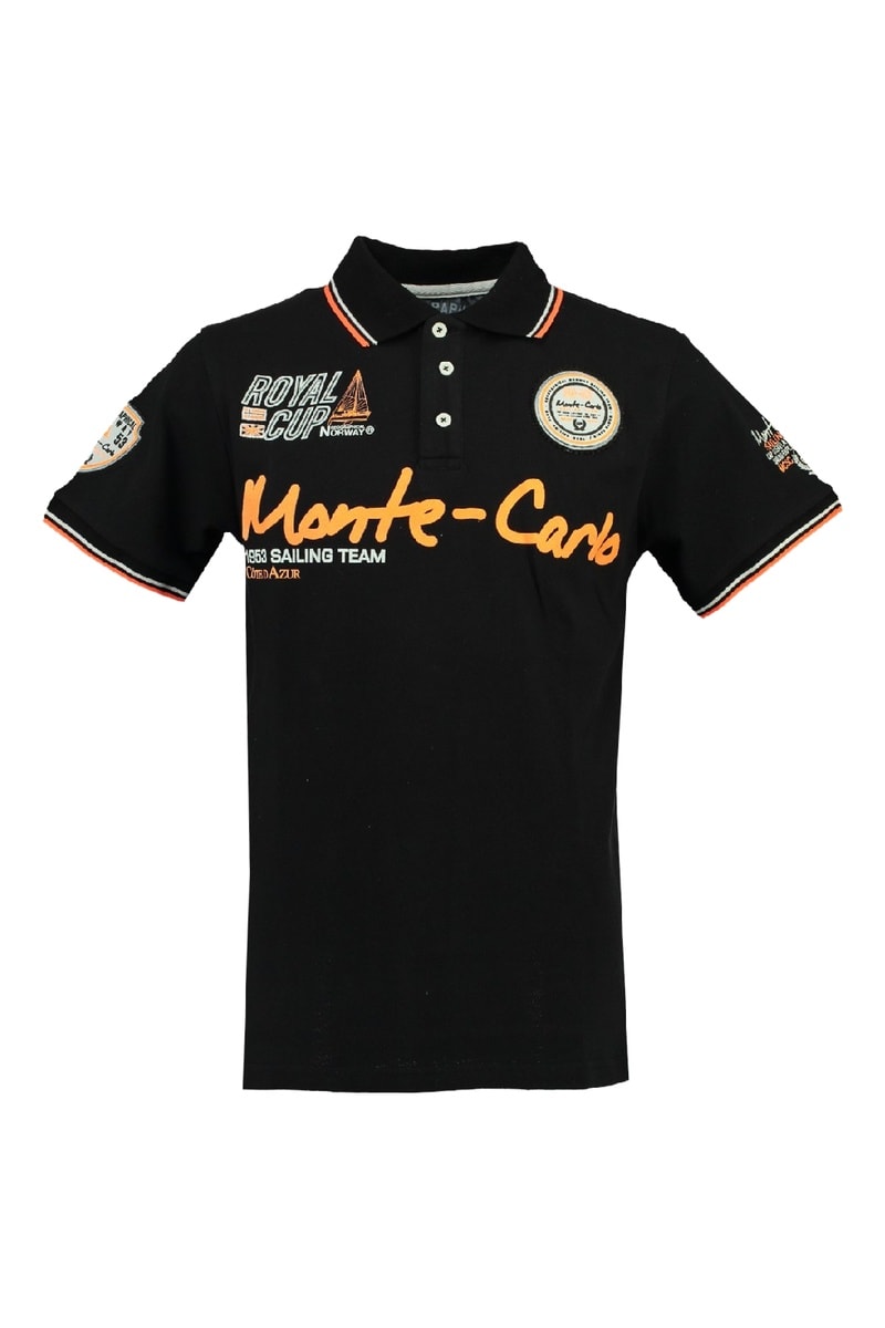 Polo de manga corta con escudos y texto.