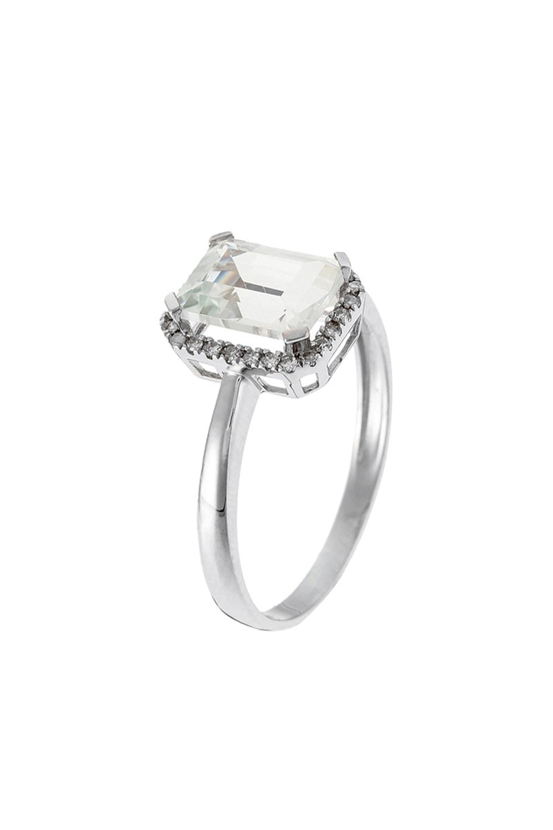 Anillo de oro blanco con un topacio y 26 diamantes.