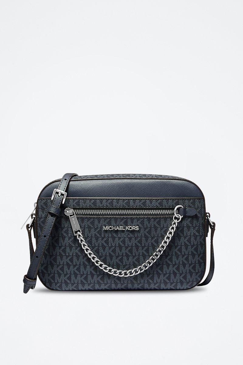 Bolsillo con cremallera con cadena y logo metálico delante.
