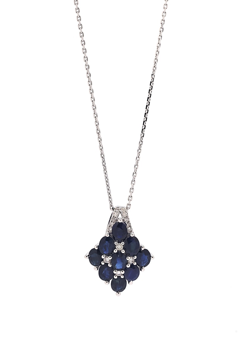 Colgante de oro blanco con 14 diamantes y 9 zafiros.