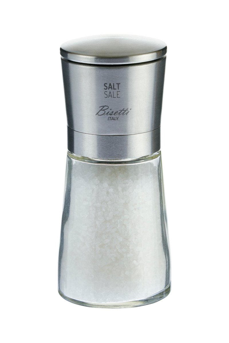 Molinillo de sal de cristal y acero inoxidable.