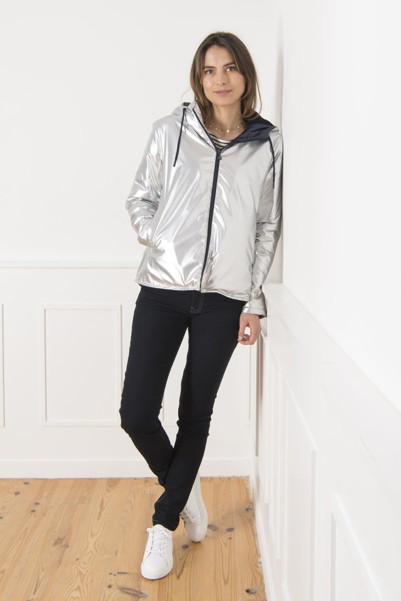 Cortavientos con capucha y tiras de ajuste.