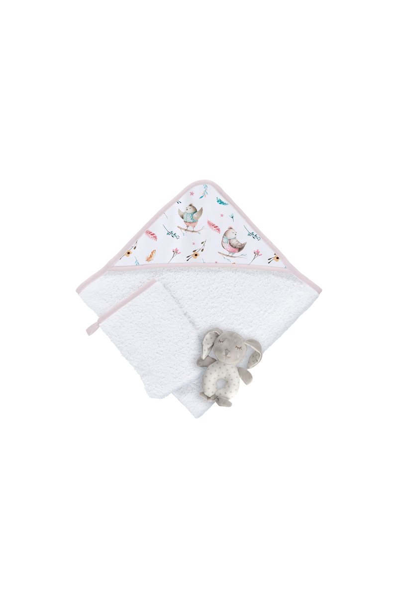 Estuche capa de baño, manopla y doudou Birds Explorer - 3 artículos - 75 x 75 cm - Blanco y rosa
