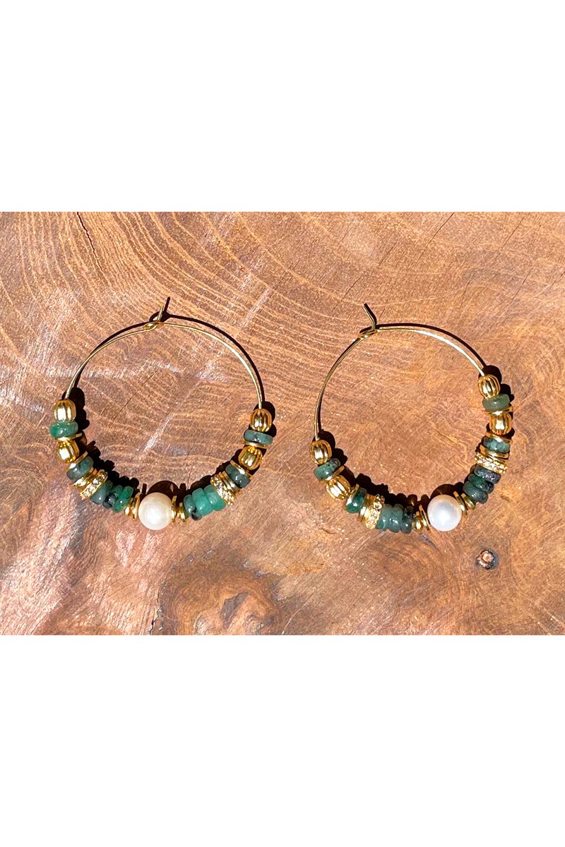 Criollas bañadas en oro fino amarillo con esmeraldas y perla cultivada.