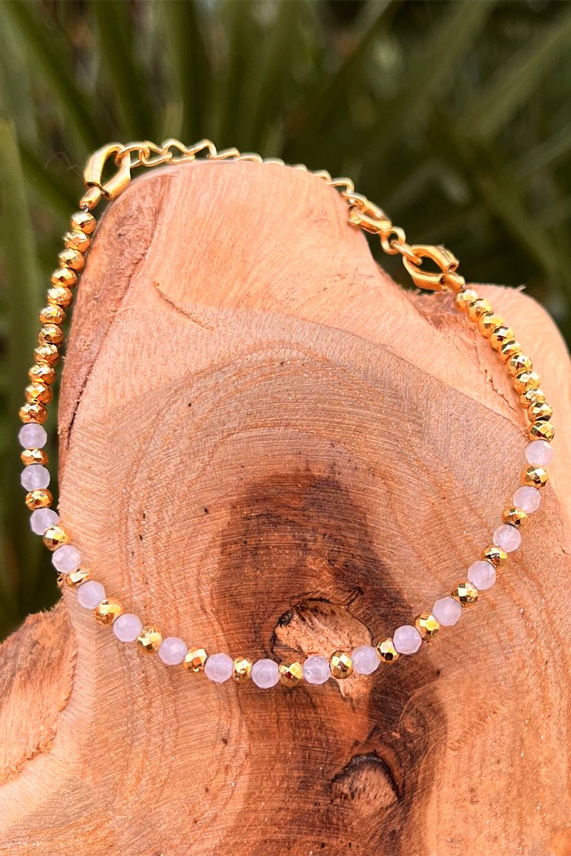 Pulsera bañada en oro fino amarillo con cuarzos rosas y piritas.