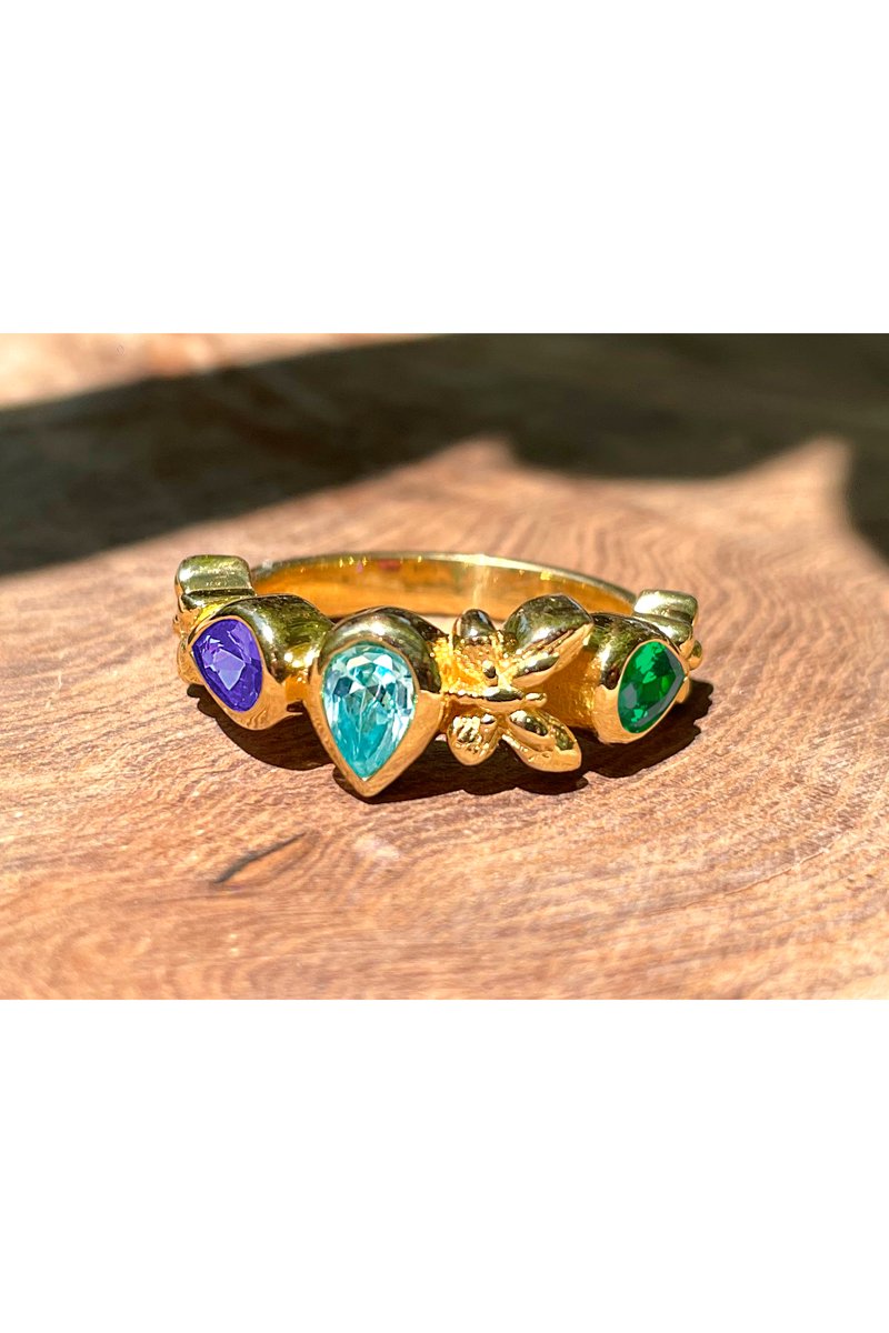 Anillo bañado en oro fino amarillo con piedras sintéticas.