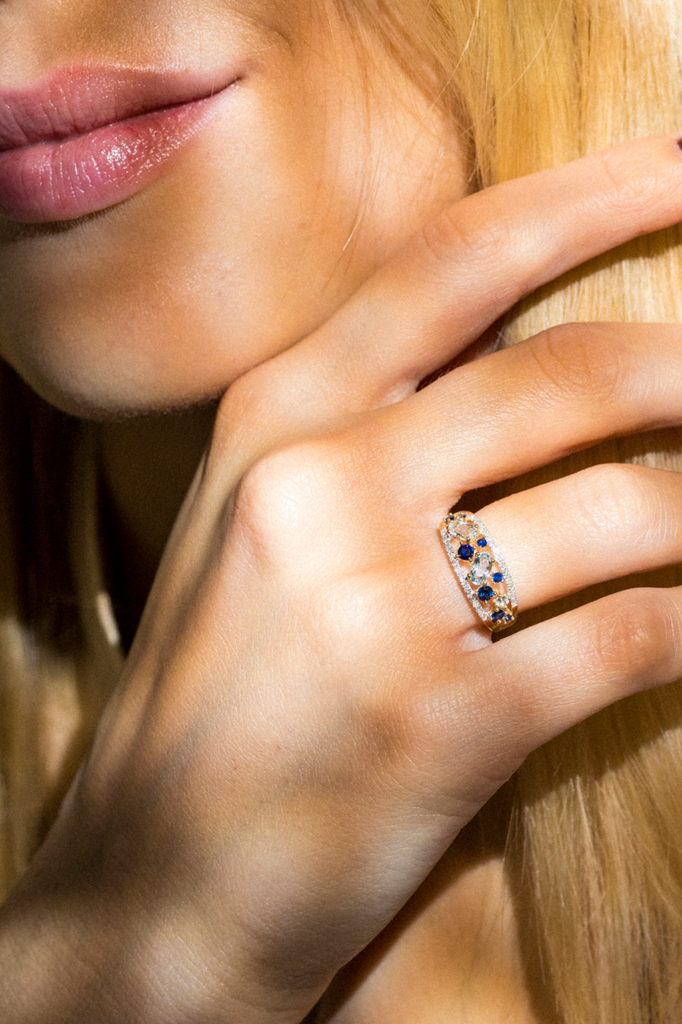 Anillo Dahra - Oro amarillo, diamantes, topacios y zafiros