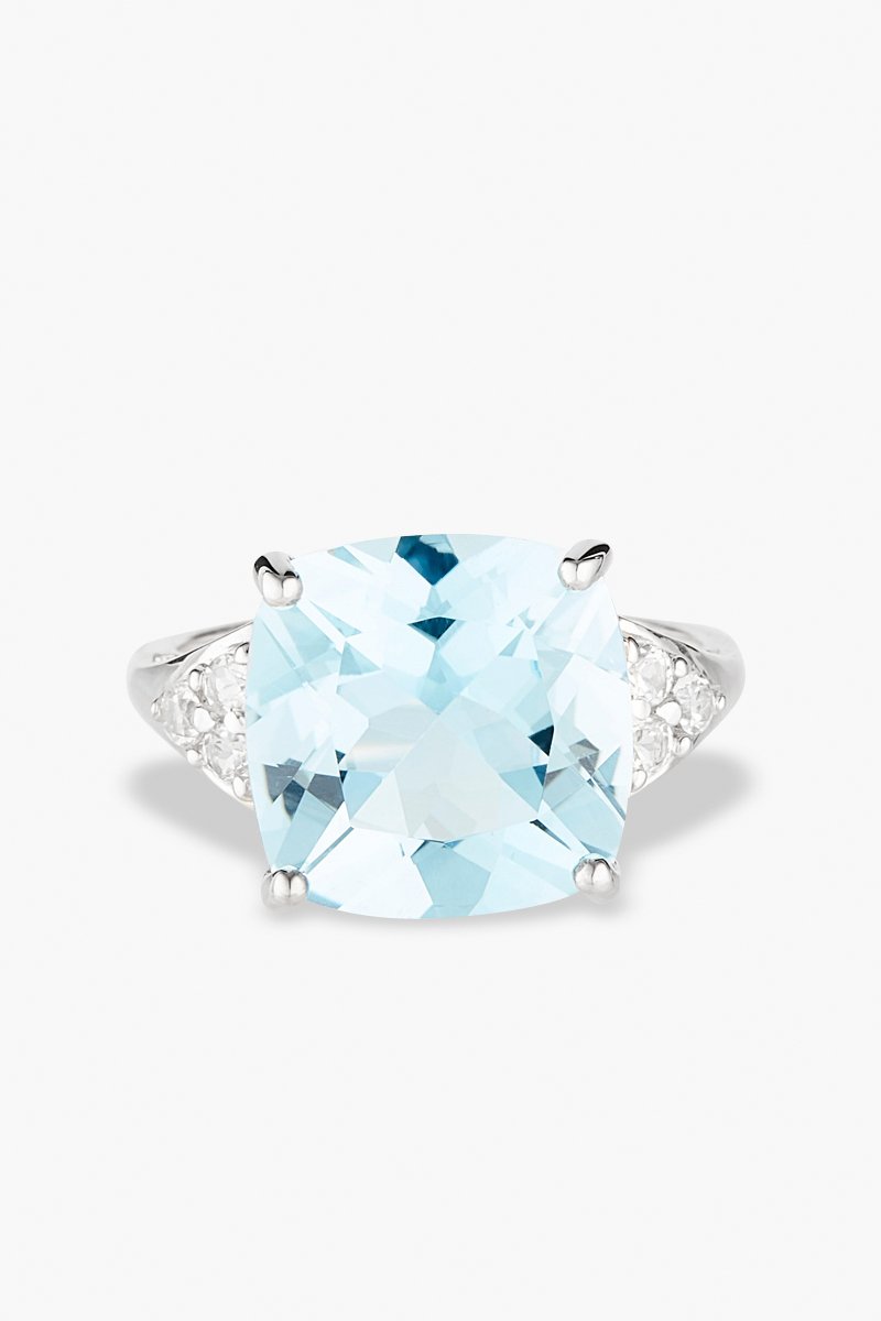 Anillo de oro blanco con 6 topacios blancos y un topacio azul.
