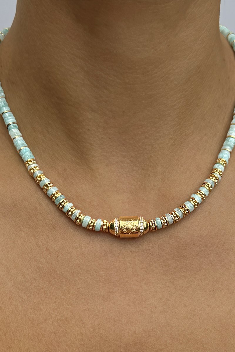 Collar chapado en oro amarillo con amazonitas y piedras sintéticas.