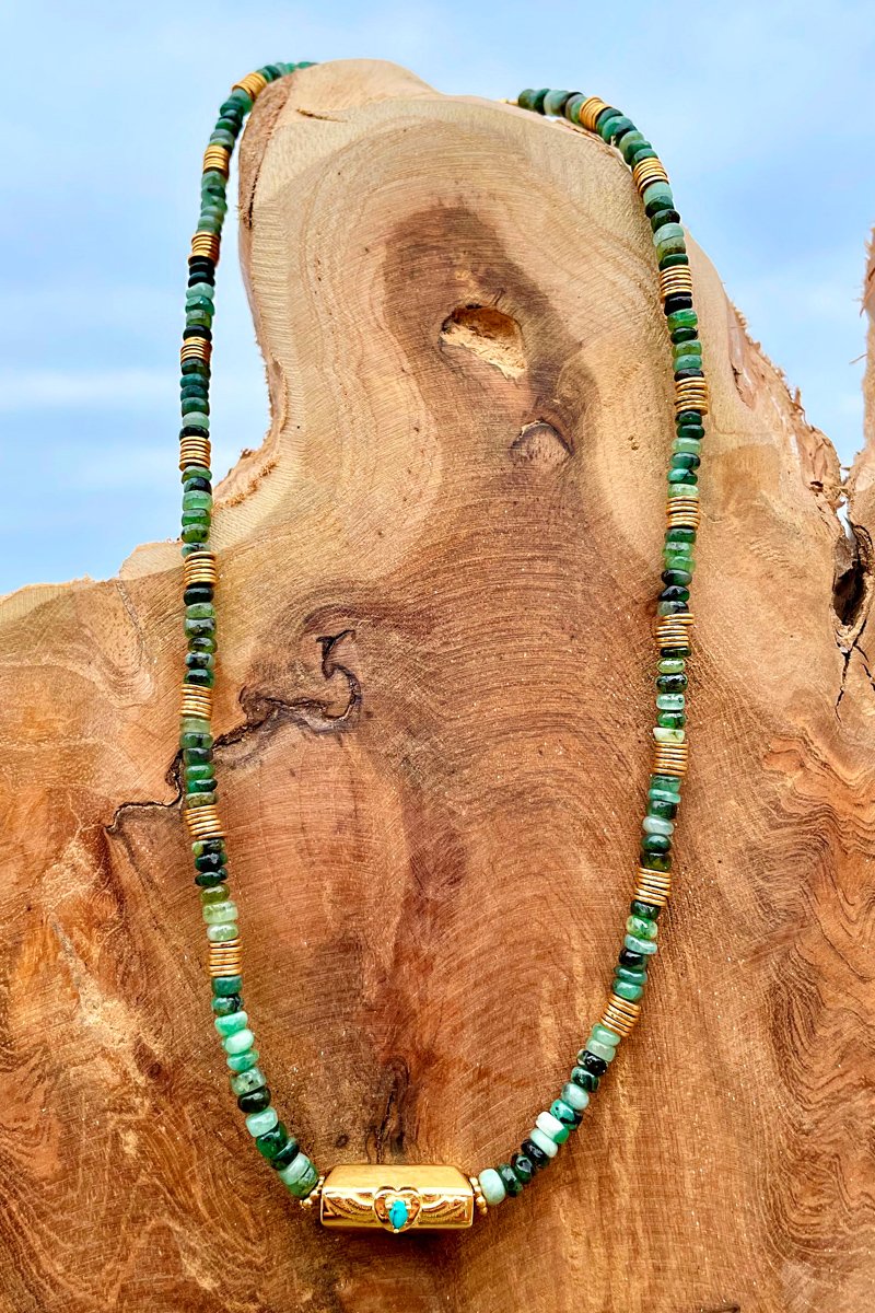 Collar bañado en oro fino amarillo con esmeraldas y turquesas.