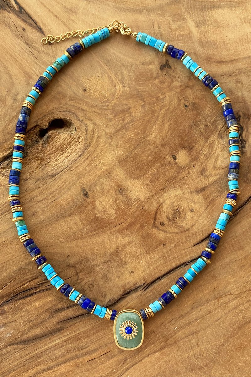 Collar bañado en oro fino amarillo con lapislázulis y amazonita.