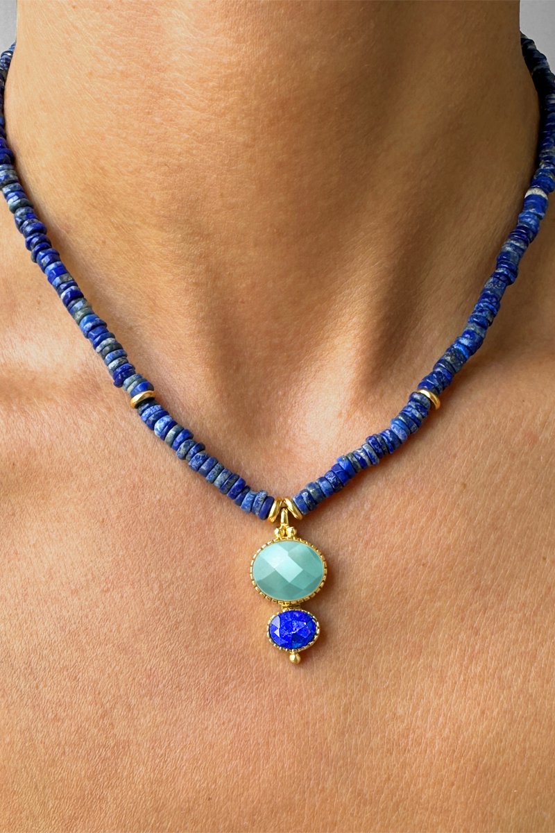 Collar chapado en oro amarillo con una amazonita y lapislázulis.