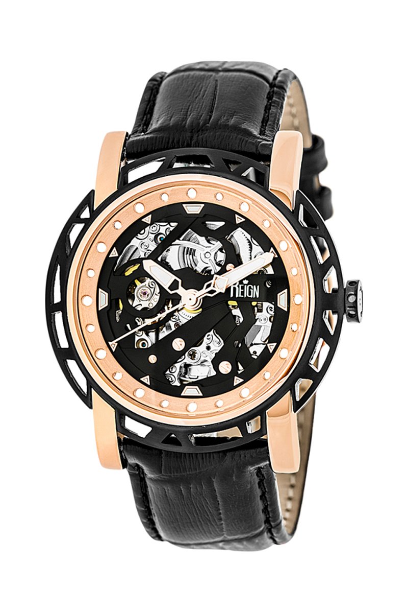Reloj automático de piel Stavros - Negro y rosa dorado