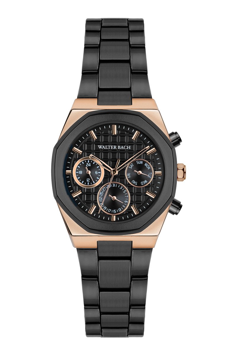 Reloj de cuarzo de acero - Negro y rosa dorado - Walter Bach