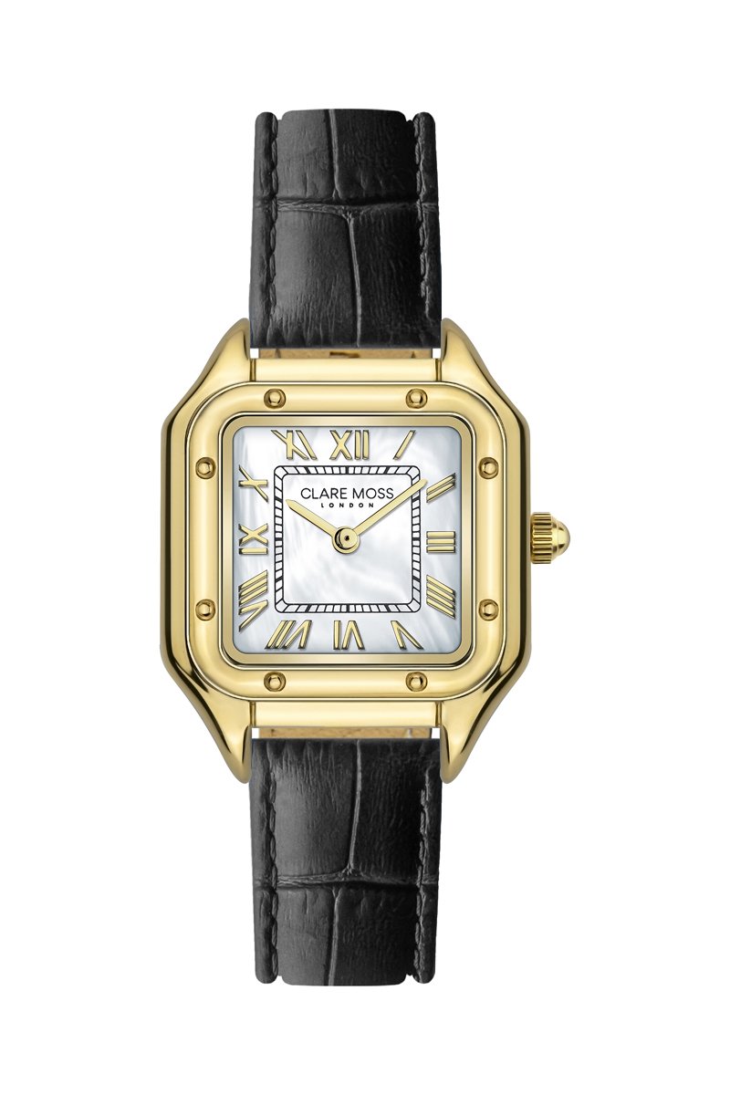 Reloj de cuarzo de piel bovina y nácar Champagne - Negro y dorado