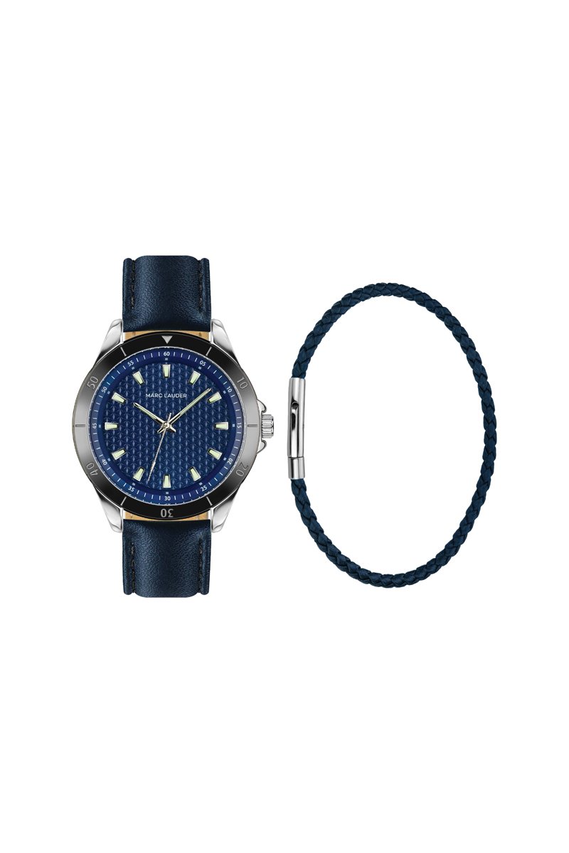 Estuche reloj de cuarzo de acero y pulsera de piel