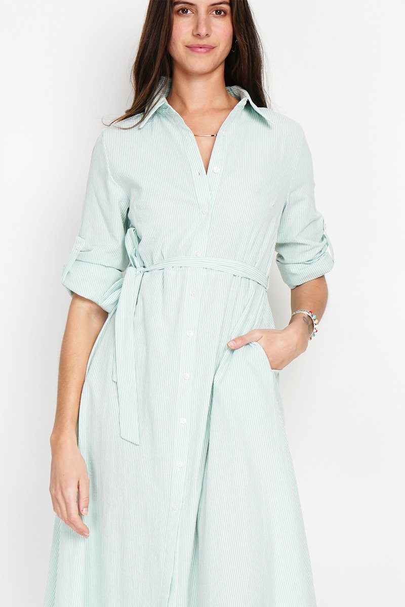 Vestido camisero de lino - Verde y blanco