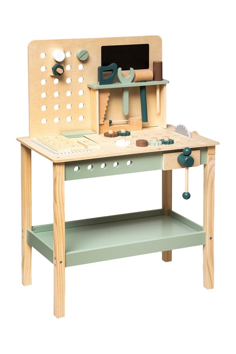 El peque utiliza las distintas herramientas y accesorios para imitar las actividades de bricolaje, favoreciendo la motricidad fina, la coordinación mano-ojo y la imaginación.