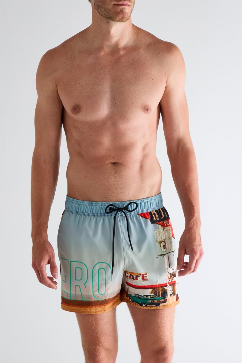 Bañador corto - Celeste y naranja