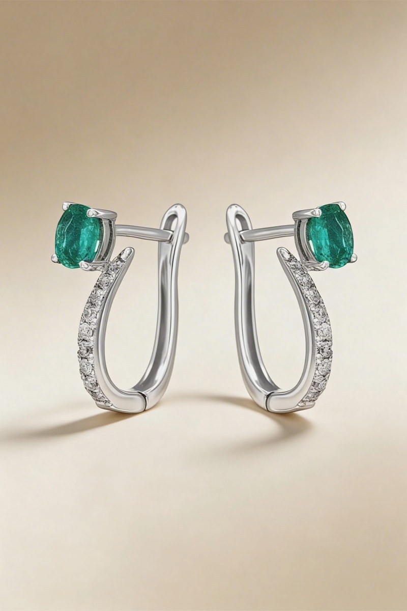 Pendientes de oro blanco con 9 diamantes y una esmeralda.