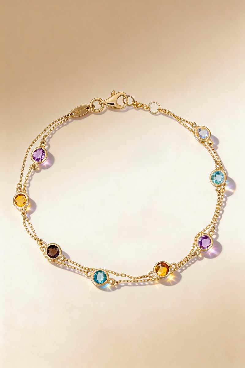 Pulsera de oro amarillo con 2 amatistas, 3 topacios 2 citrinos y un cuarzo ahumado.