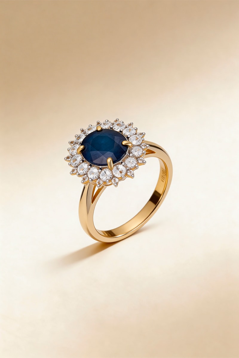 Anillo de oro amarillo con 28 topacios y un zafiro.