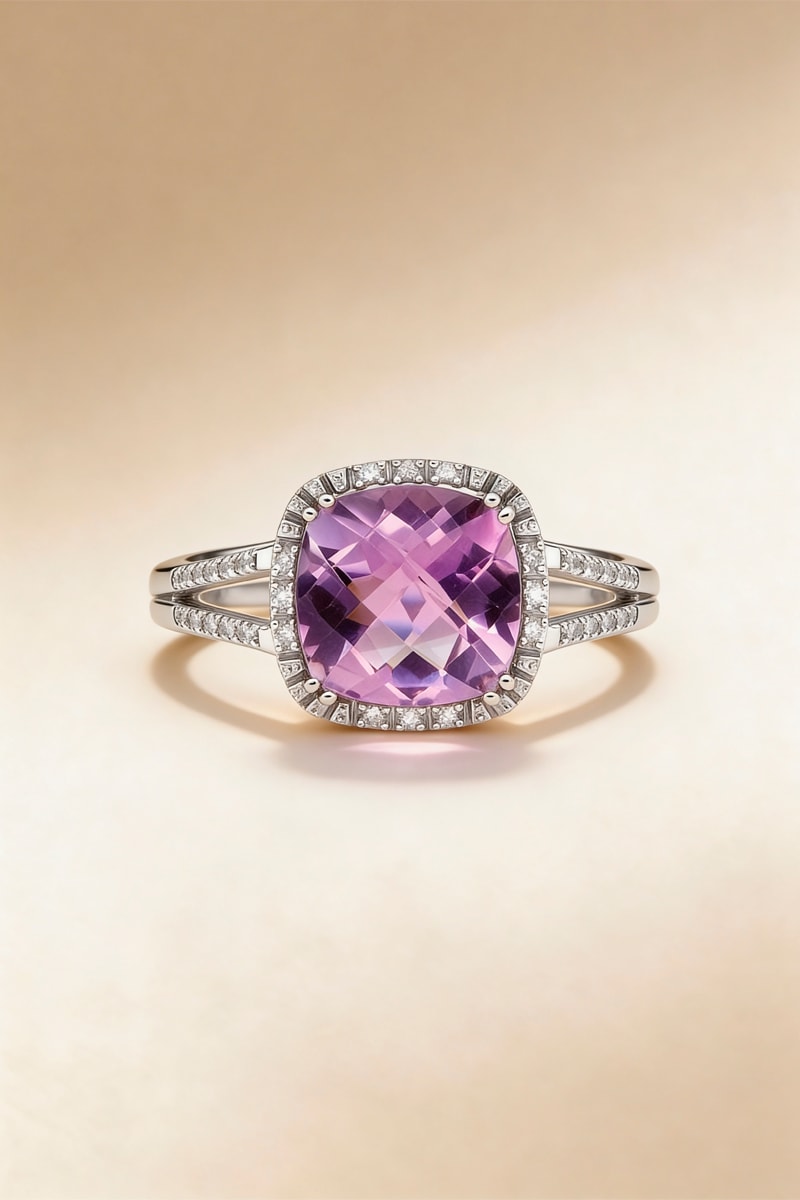 Anillo de oro blanco con 32 diamantes y una amatista.