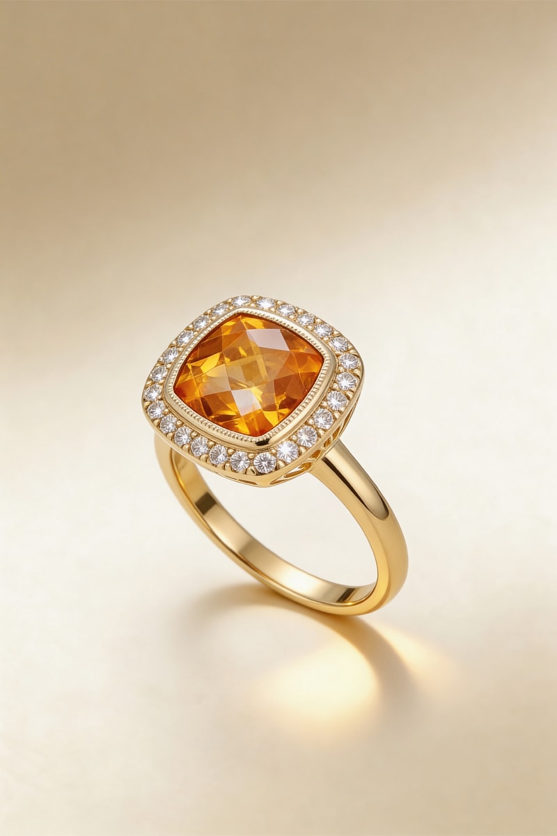 Anillo de oro amarillo con 24 diamantes y un citrino.