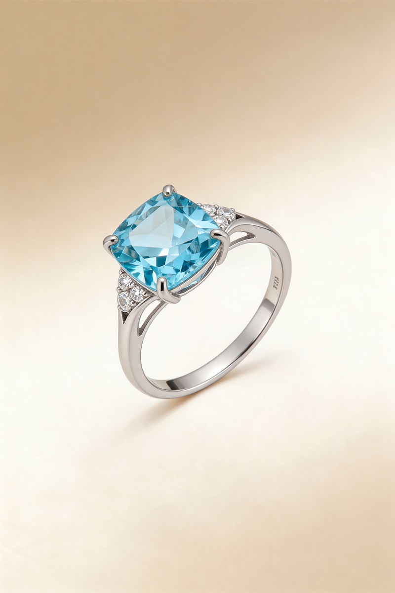 Anillo de oro blanco con 6 topacios blancos y un topacio azul.