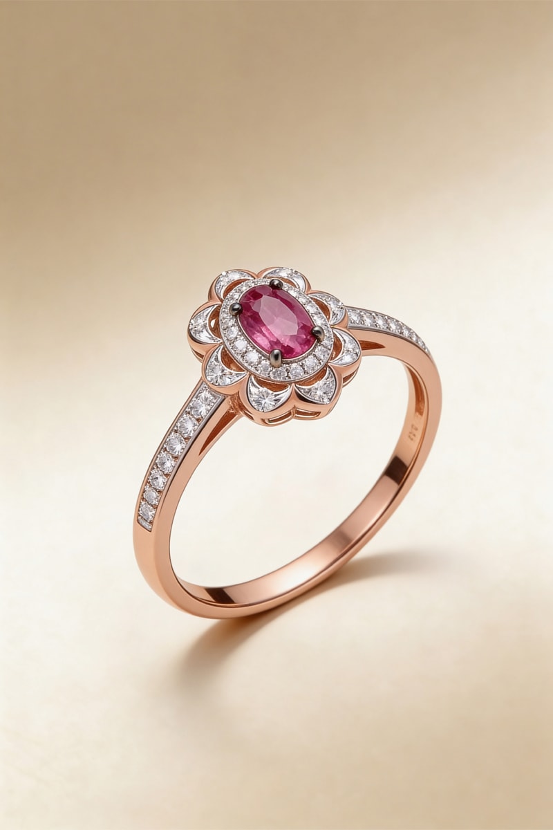 Anillo de oro rosa con diamantes y un rubí.