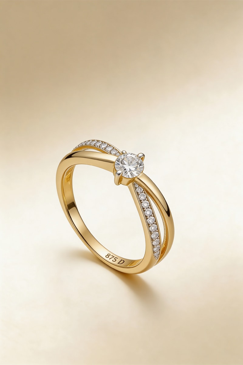 Anillo de oro amarillo con 19 diamantes, 1 de ellos solitario.