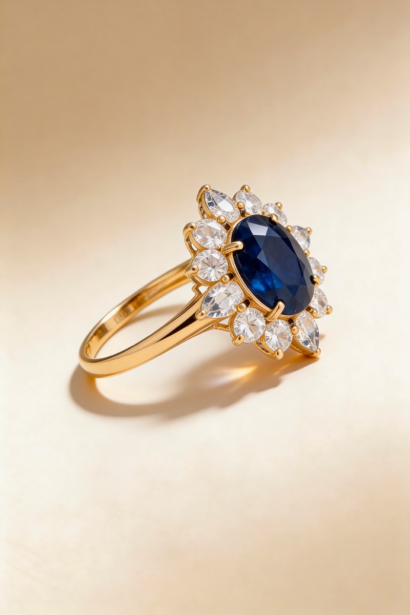 Anillo de oro amarillo con diamantes y un zafiro.