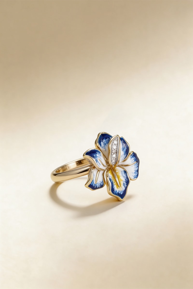 Anillo de oro amarillo con 5 diamantes y esmalte.