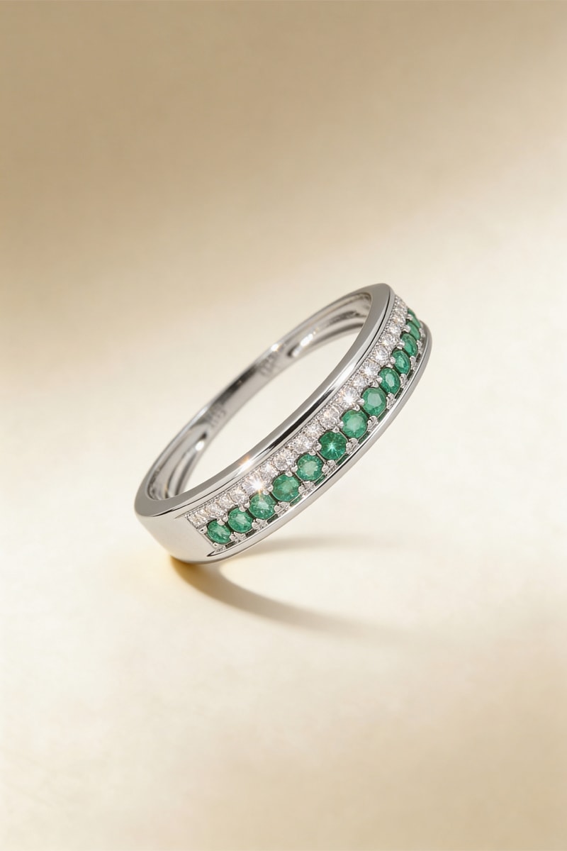 Anillo de oro blanco con 26 diamantes y 16 esmeraldas.
