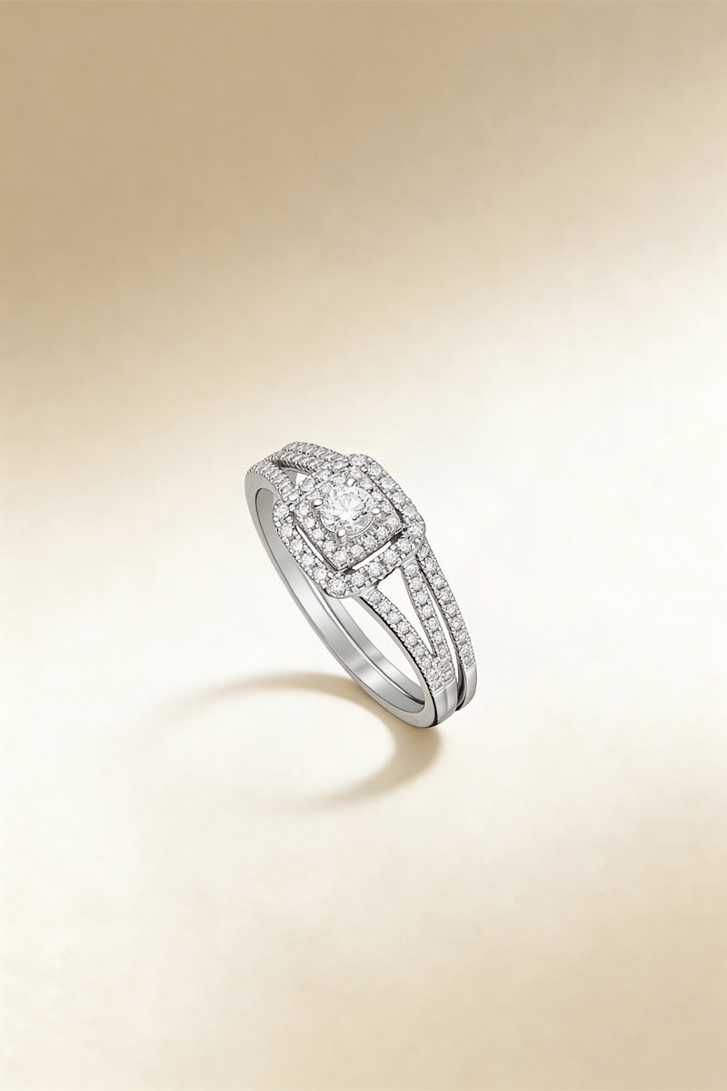 Alianza y solitario de oro blanco con 101 diamantes, 1 de ellos un solitario.