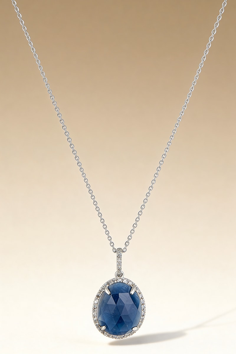 Colgante de oro blanco con un zafiro y 30 diamantes.