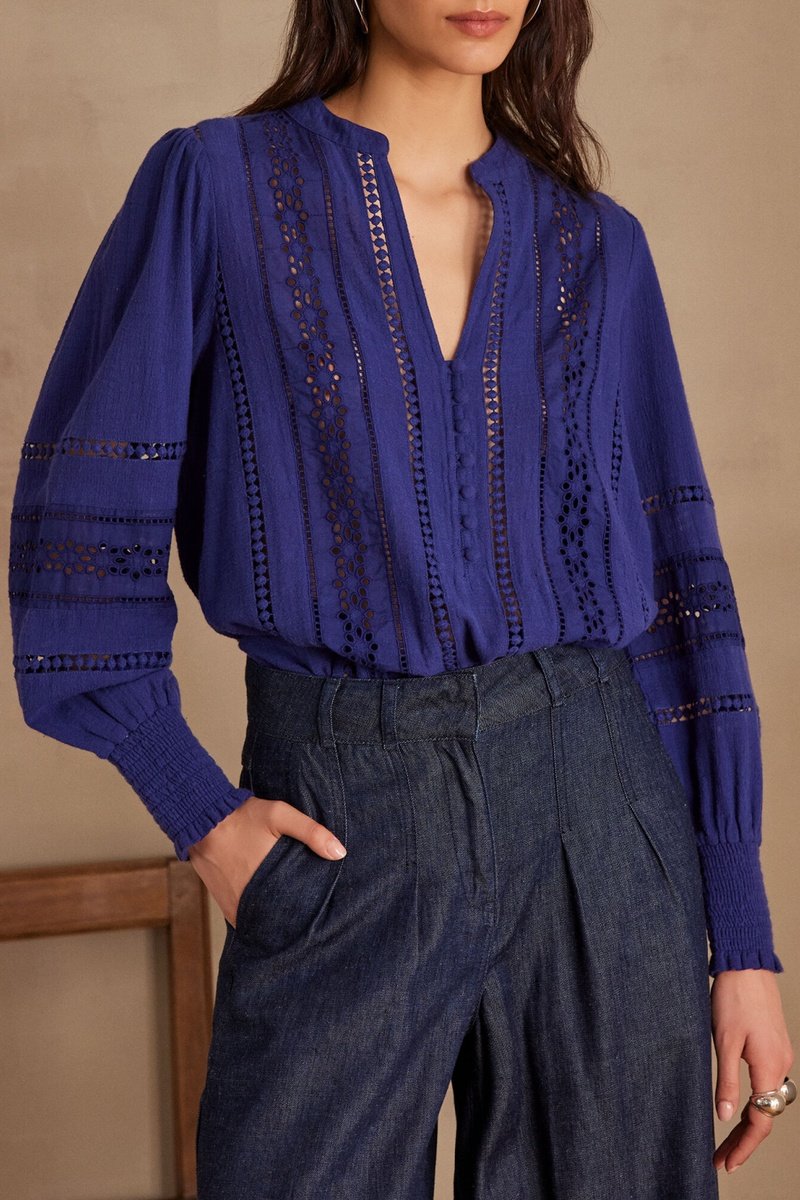 Detalles con bordado inglés y galones bordados en las mangas y delante.