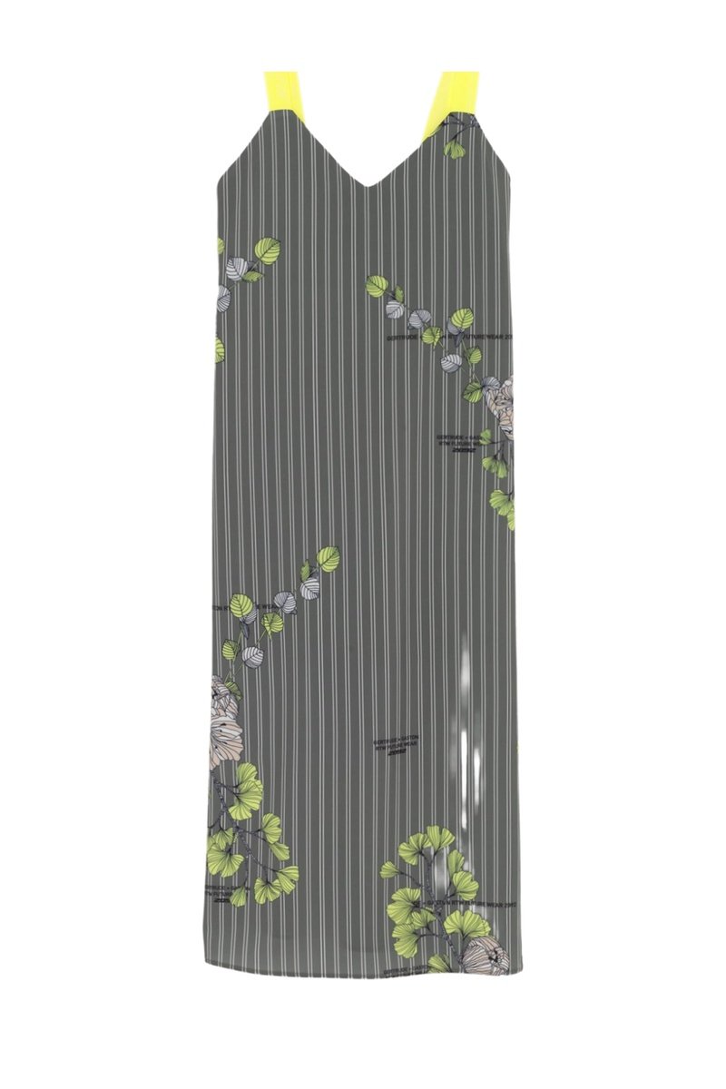 Texto, estampado de rayas, flores y logo.