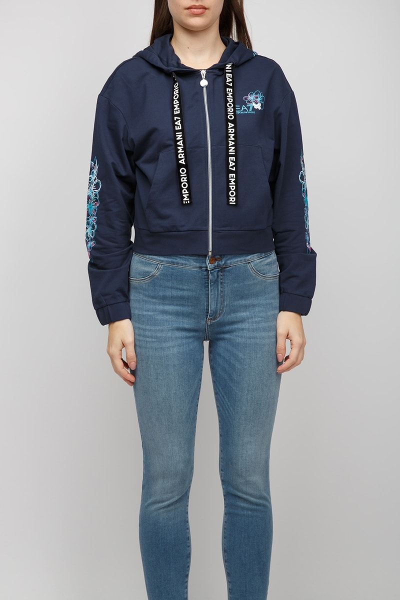 Estampado de flores en la capucha, en las mangas y delante.