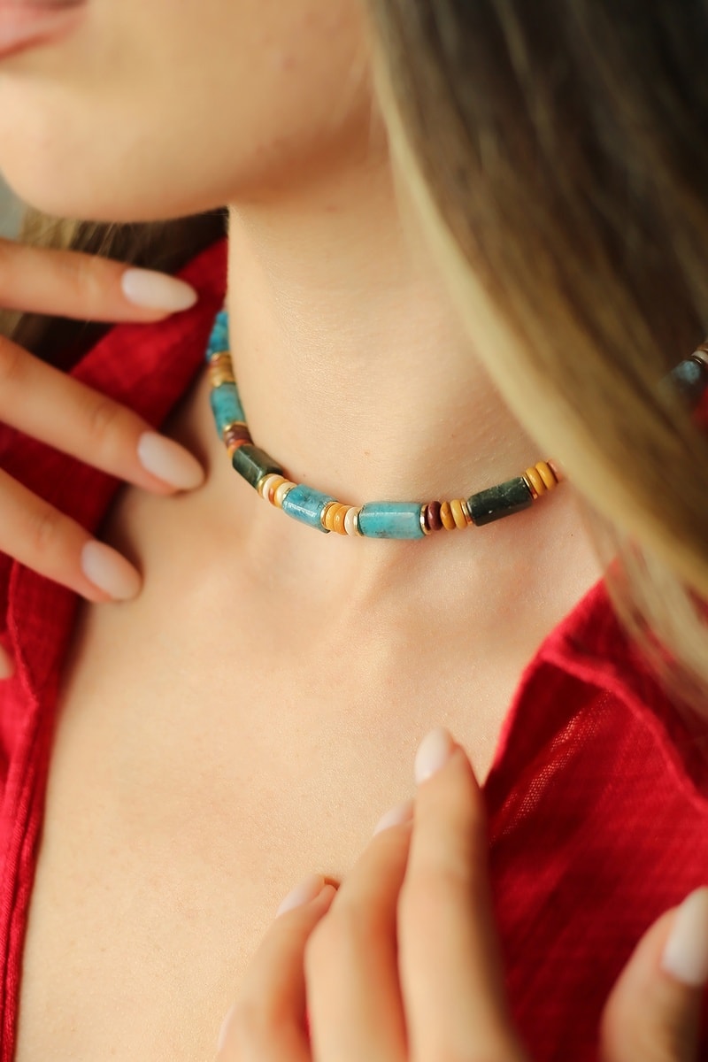 Collar chapado en oro amarillo con turquesas y ojos de tigre.