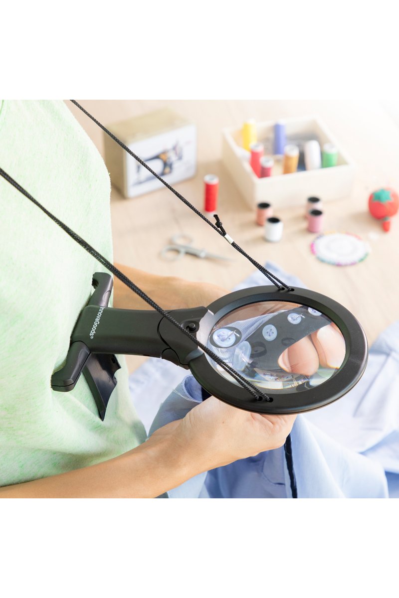 Lupa de lectura, manos libres (se puede colgar del cuello) y con luz de LED.
