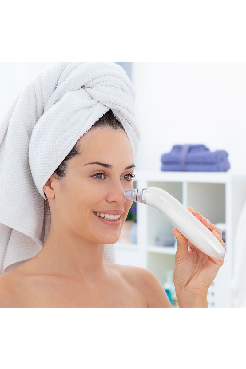 Consejos de uso: aplicar una toalla caliente durante 3-5 min en la zona a tratar. Seleccionar el cabezal y utilizar el limpiador eléctrico realizando movimientos circulares. Limpiar el rostro.