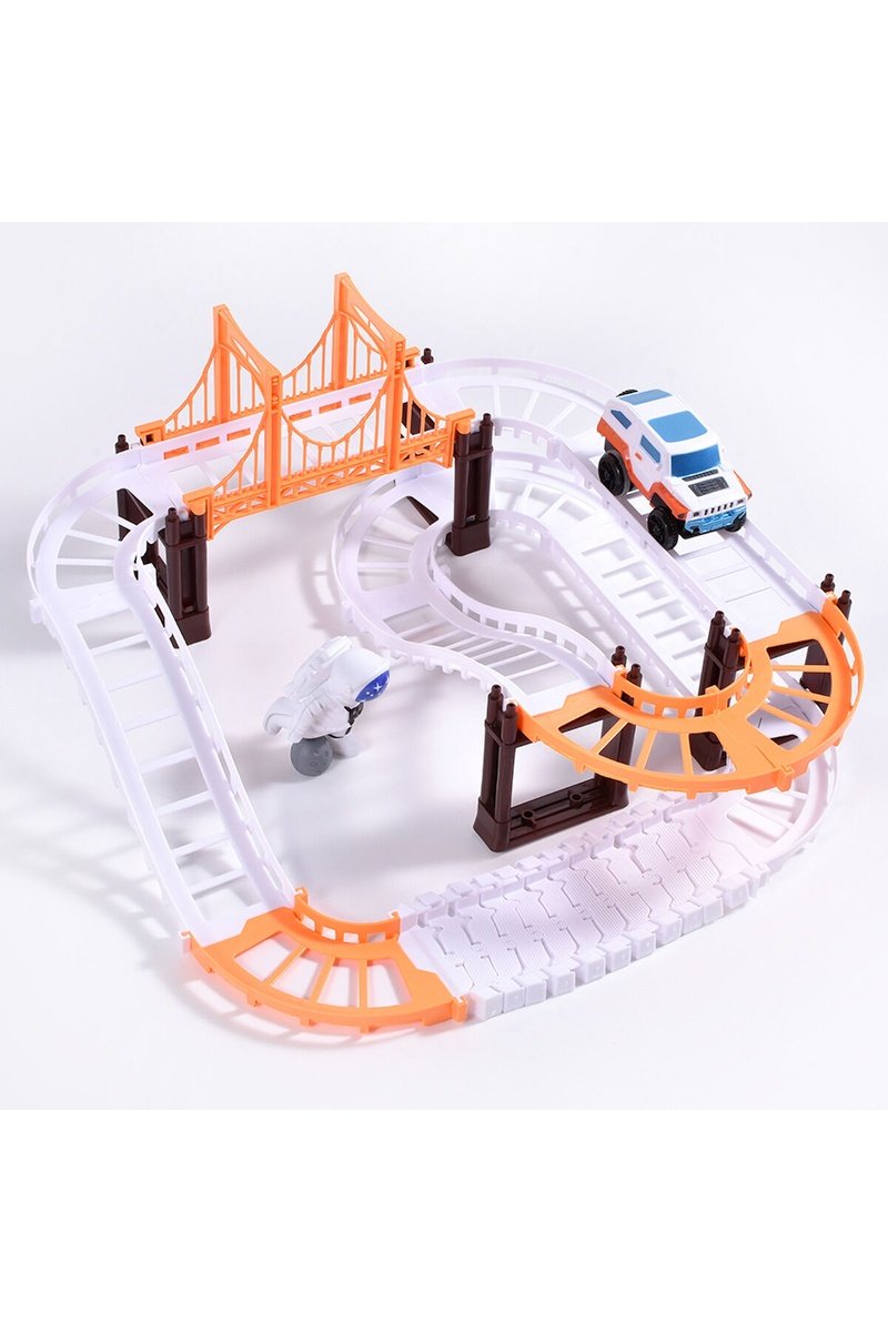 Tu peque monta las diferentes piezas para crear un circuito con temática espacial, que incluye puentes, túneles y varios niveles.