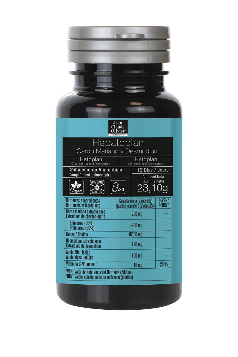 Ingredientes : almidón de maíz (Almidón de maíz, Agente de carga [Fosfatos de calcio], Agente de carga [Celulosa]), Cardo mariano extracto seco (Silybum marianum L., semilla), Componentes de la cubierta de la cápsula (Hidroxipropilmetilcelulosa), Colina (Bitartrato de colina), Desmodium extracto seco (Desmodium adscendens DC, parte aérea), Ácido Alfa lipoico, Antiaglomerantes (Sales magnésicas de ácidos grasos, Monoglicéridos de ácidos grasos y Dióxido de silicio), Vitamina C (Ácido L-ascórbico).